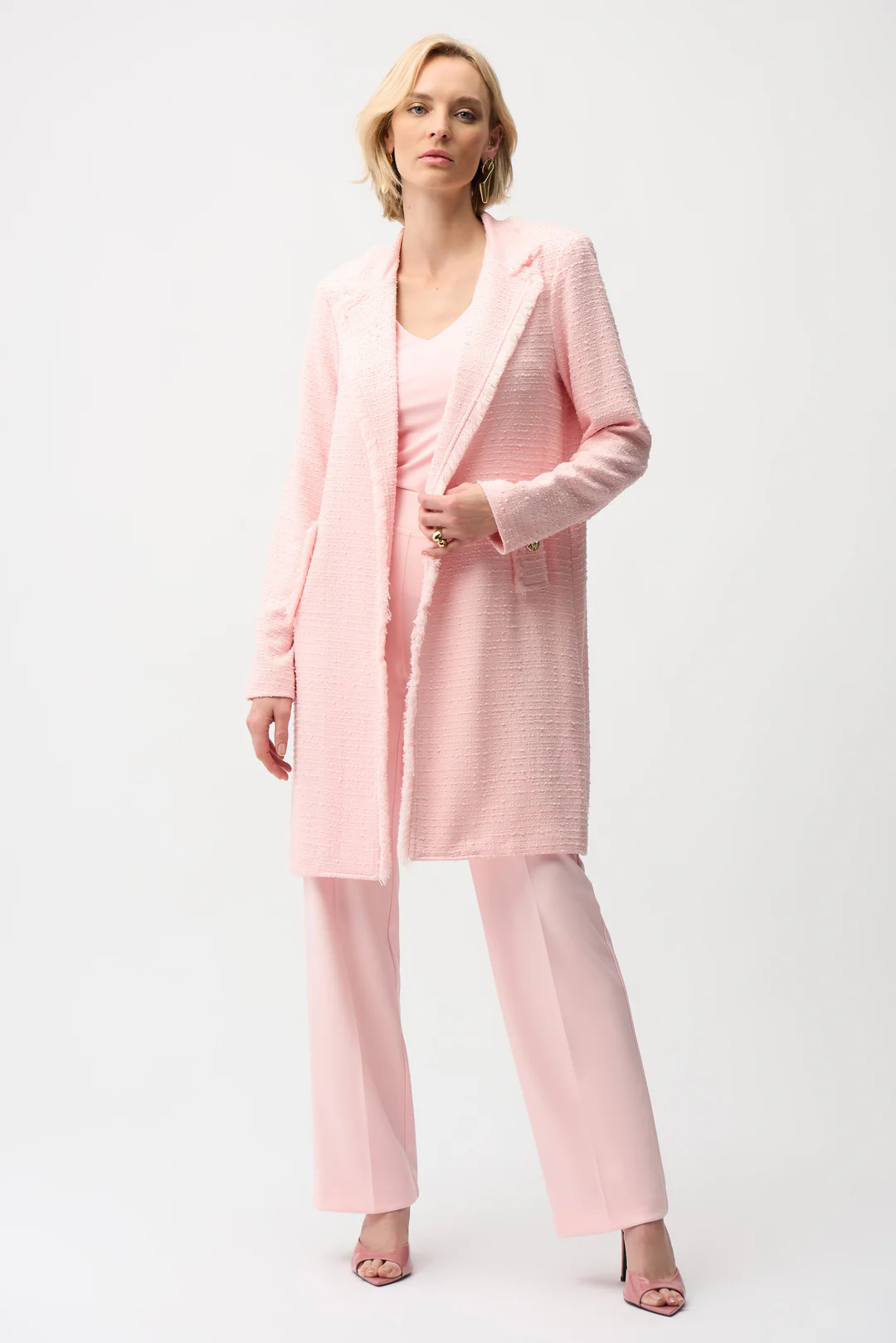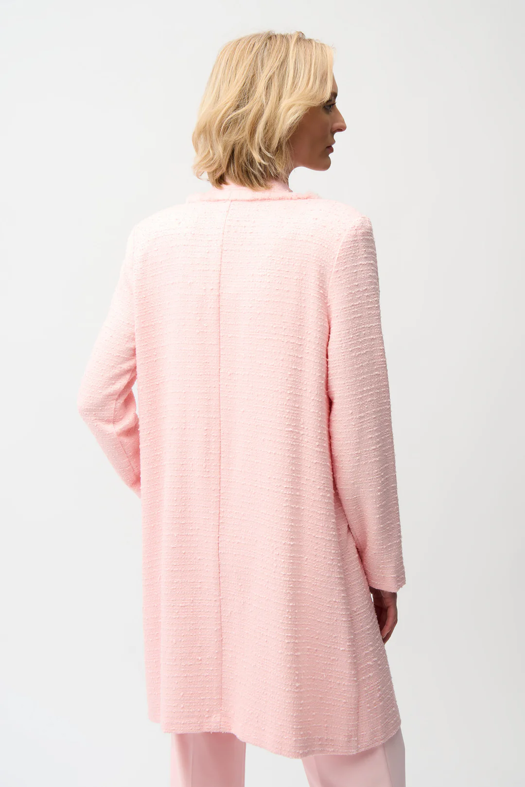 El abrigo de bouclé de Joseph Ribkoff redefine la elegancia con su diseño atemporal y textura refinada. Confeccionado para destacar, este modelo combina confort y estilo en un equilibrio perfecto. Su clásico cuello con solapa genera una apariencia sofisticada ideal para diversos entornos, mientras que el frente abierto adornado con un delicado ribete de flecos añade un toque de dinamismo a su diseño.