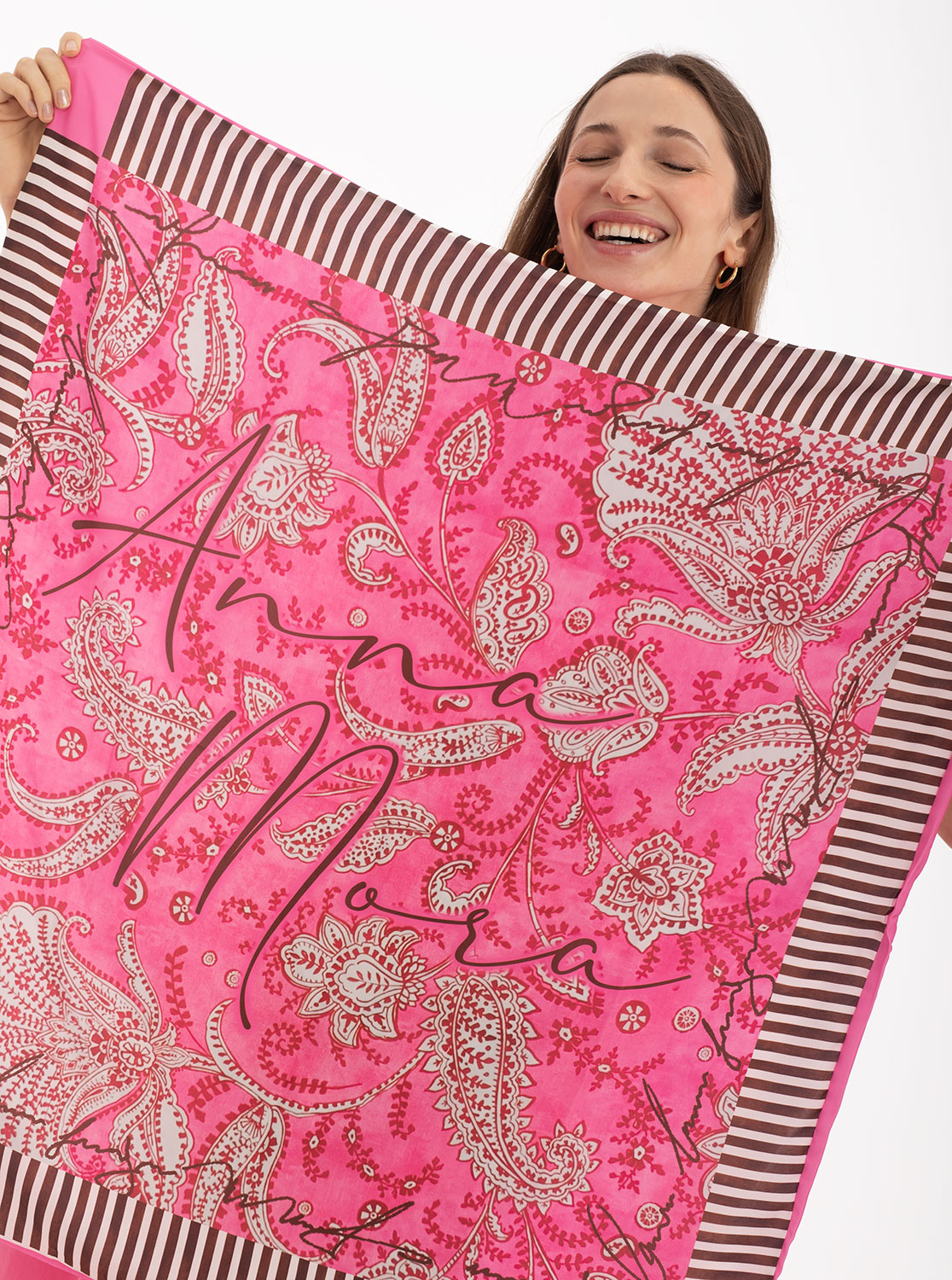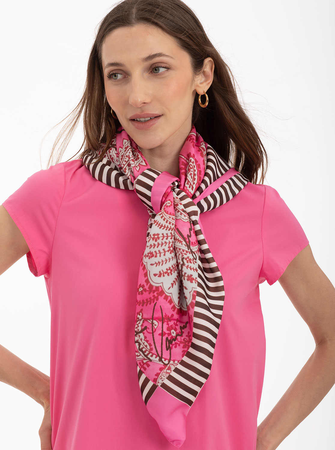 El dibujo cachemir en tonos rosas, combinado con el detalle de su borde recto y rayas en tonos marrones, aporta una mezcla armoniosa de texturas y colores. Este diseño intemporal se inspira en patrones tradicionales, reinventados para integrarse en el vestuario moderno. Es ideal para quienes desean destacar con piezas sutiles pero impactantes.