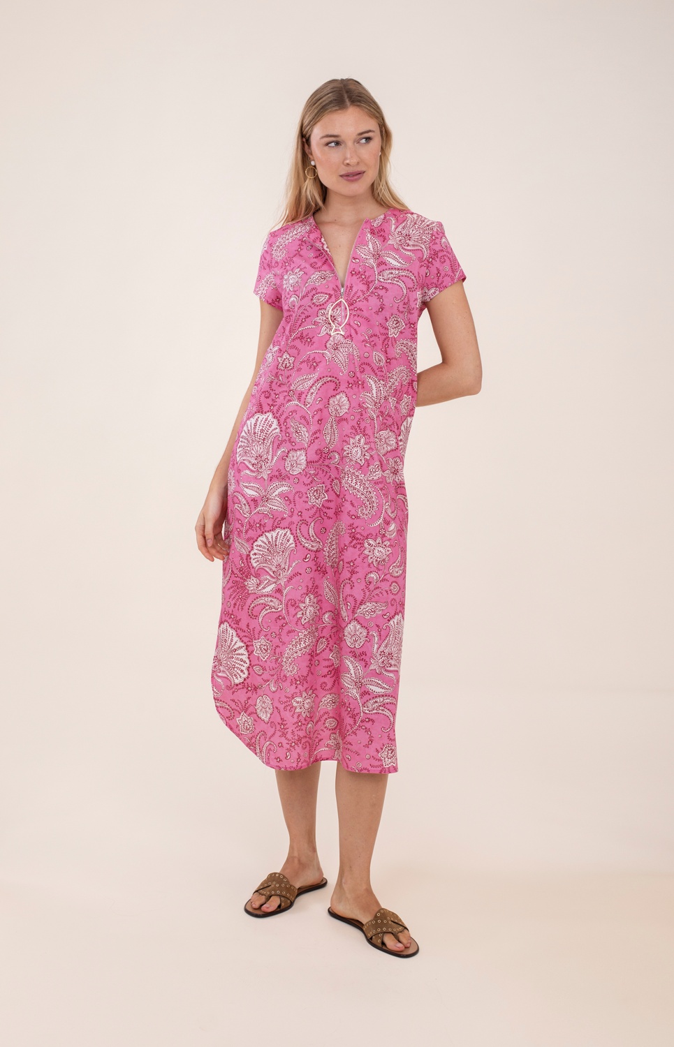 El estampado étnico en tonos de rosa no solo está de moda, sino que también agrega un elemento cultural y vibrante a tu guardarropa. Este vestido es perfecto para todas las estaciones y puede ser combinado con accesorios minimalistas o piezas atrevidas según la ocasión.