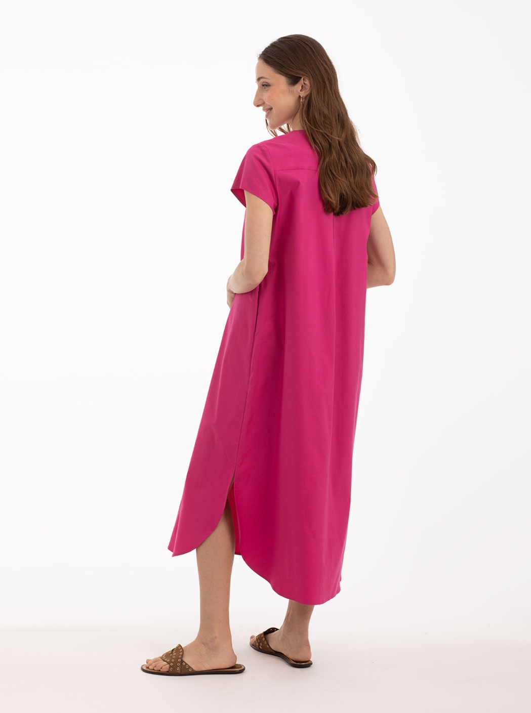 Confeccionado con materiales suaves y de calidad, este vestido camisero ofrece una libertad de movimiento excepcional. El tono rosa oscuro proporciona un aire de sofisticación, mientras que la longitud hasta la rodilla equilibra perfectamente comodidad y estilo. Combínalo con tus accesorios favoritos para destacar aún más en tu look.